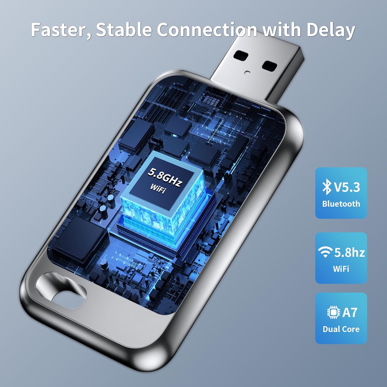 【Excellent A7 car-grade smart chip】: Helps you focus on driving. Wireless adapter is equipped with 5.8 GHZ WiFi, 5.3 Bluetooth and an 8-core processor, which increases the transmission speed by 40% while ensuring a stable connection and no delay.