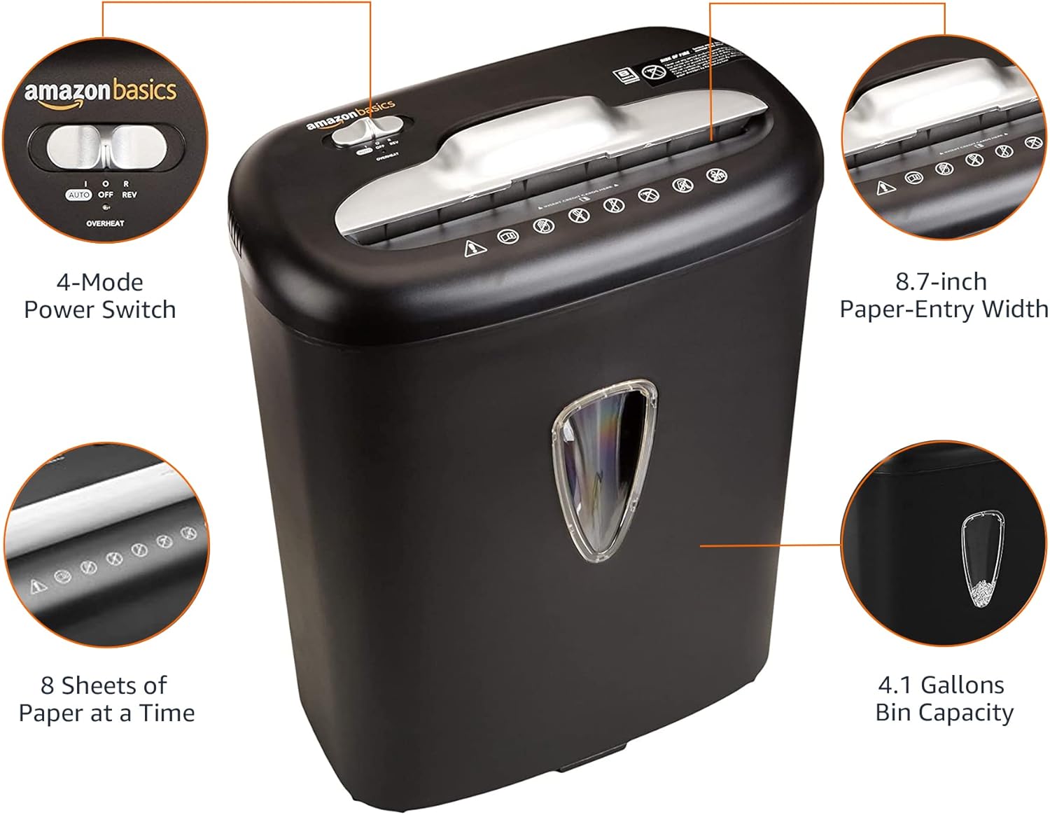 Amazon Basics 8 Sheet Cross Cut Paper and Credit Card Shredder with 4.1 Gallon Bin, Black