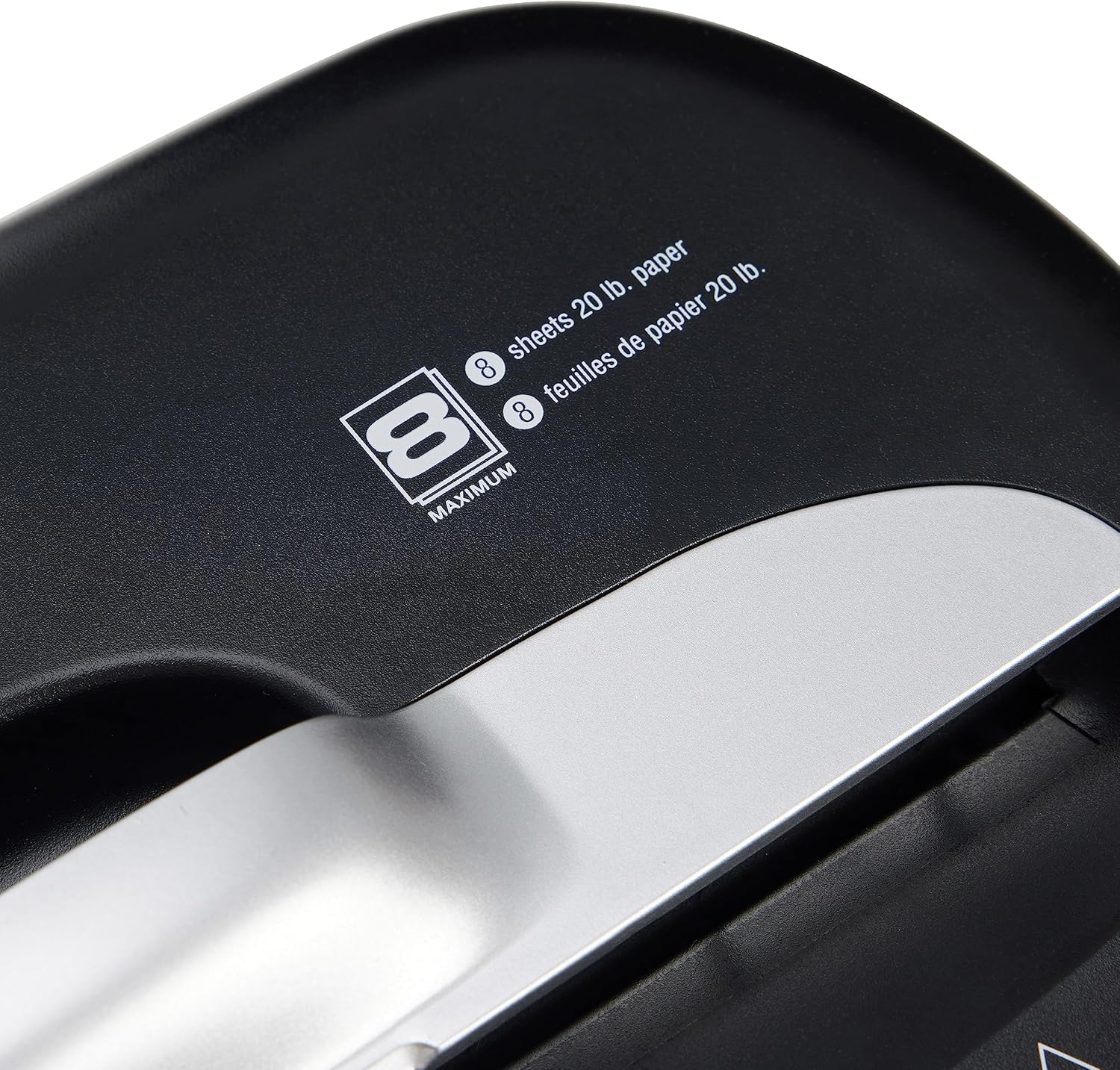 Shreds up to 8 sheets of 20-pound bond paper at a time, including staples and small paper clips; 8.7-inch-wide entry