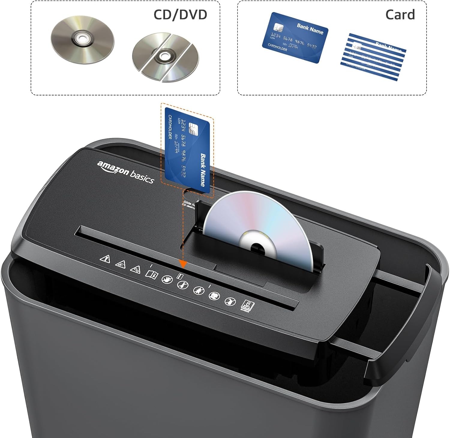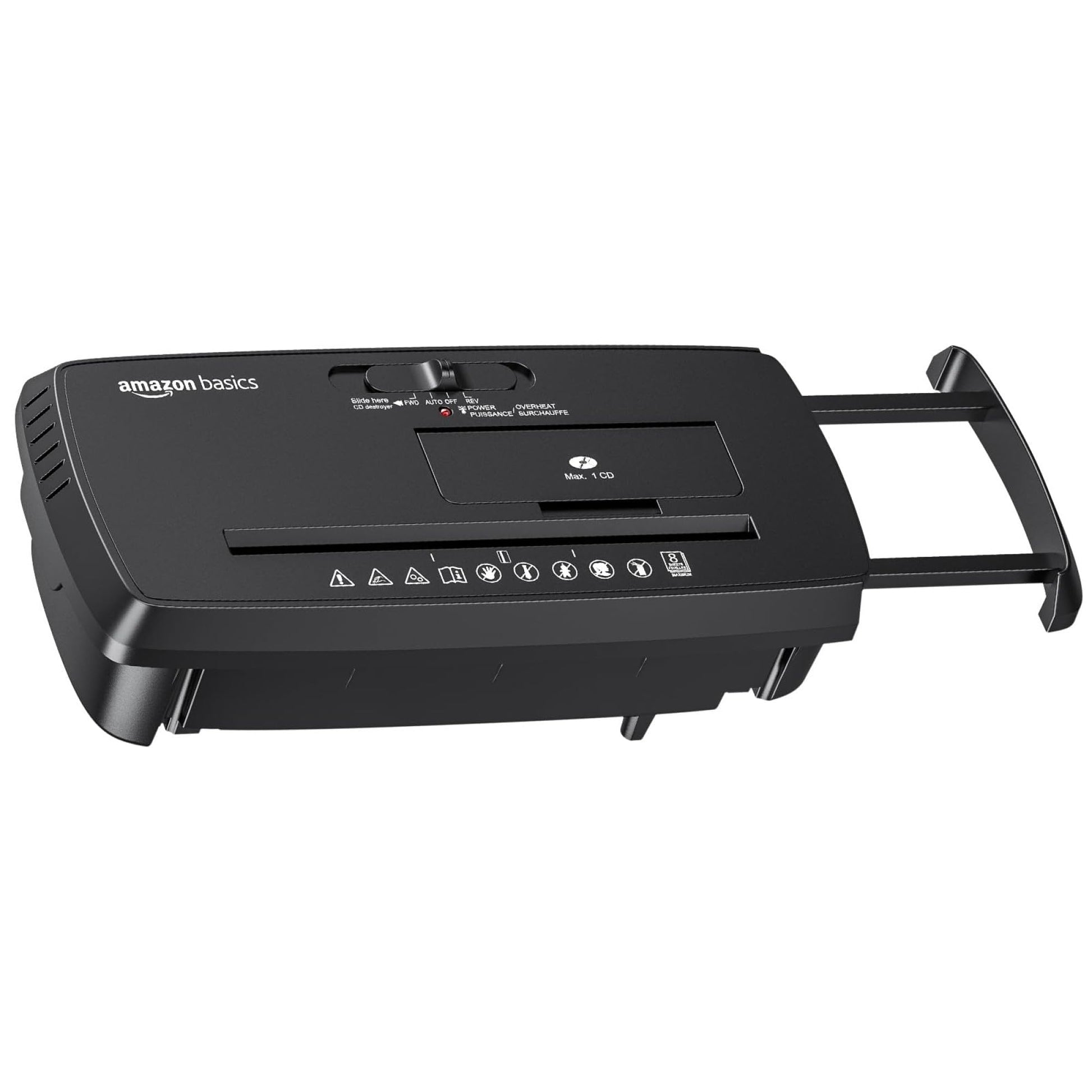 Amazon Basics 8-Sheet Strip Cut Paper, CD, and Credit Card Shredder, Compact, No Basket, Portable with Extendable Arm, Black