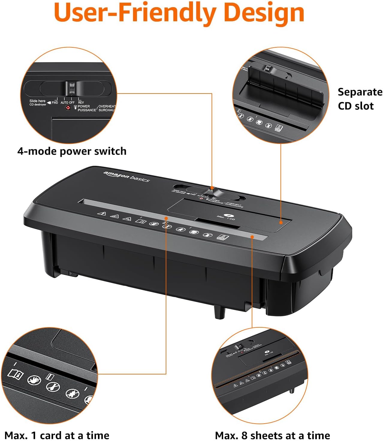 Accepts up to 8 sheets of 20-pound bond paper at a time (no need to remove staples or small paper clips)