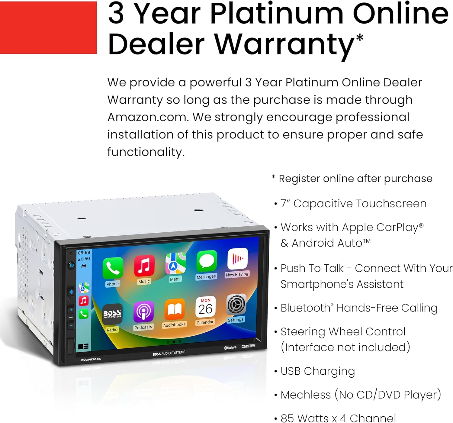 BOSS Audio Systems provides a powerful 3-year platinum online dealer warranty so long as the purchase is made through Amazon.com. We strongly encourage professional installation of this product to ensure proper and safe functionality