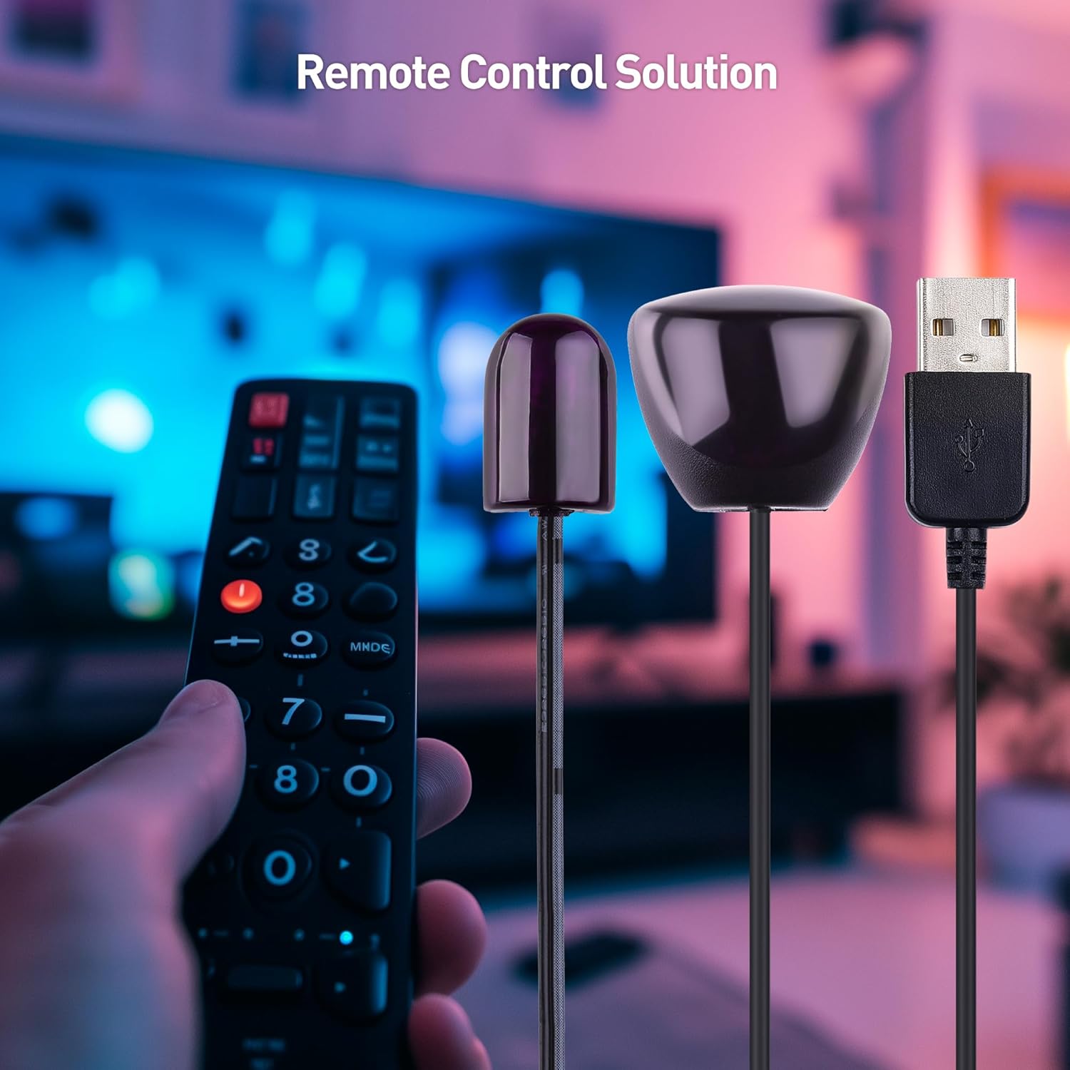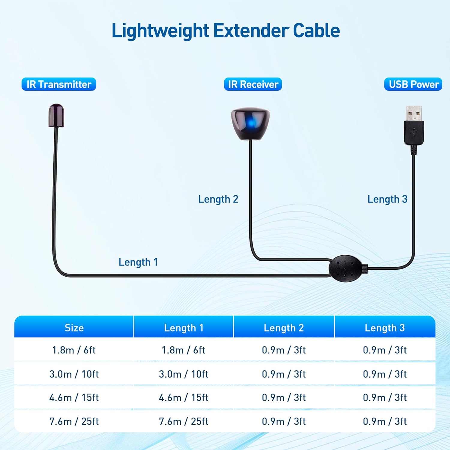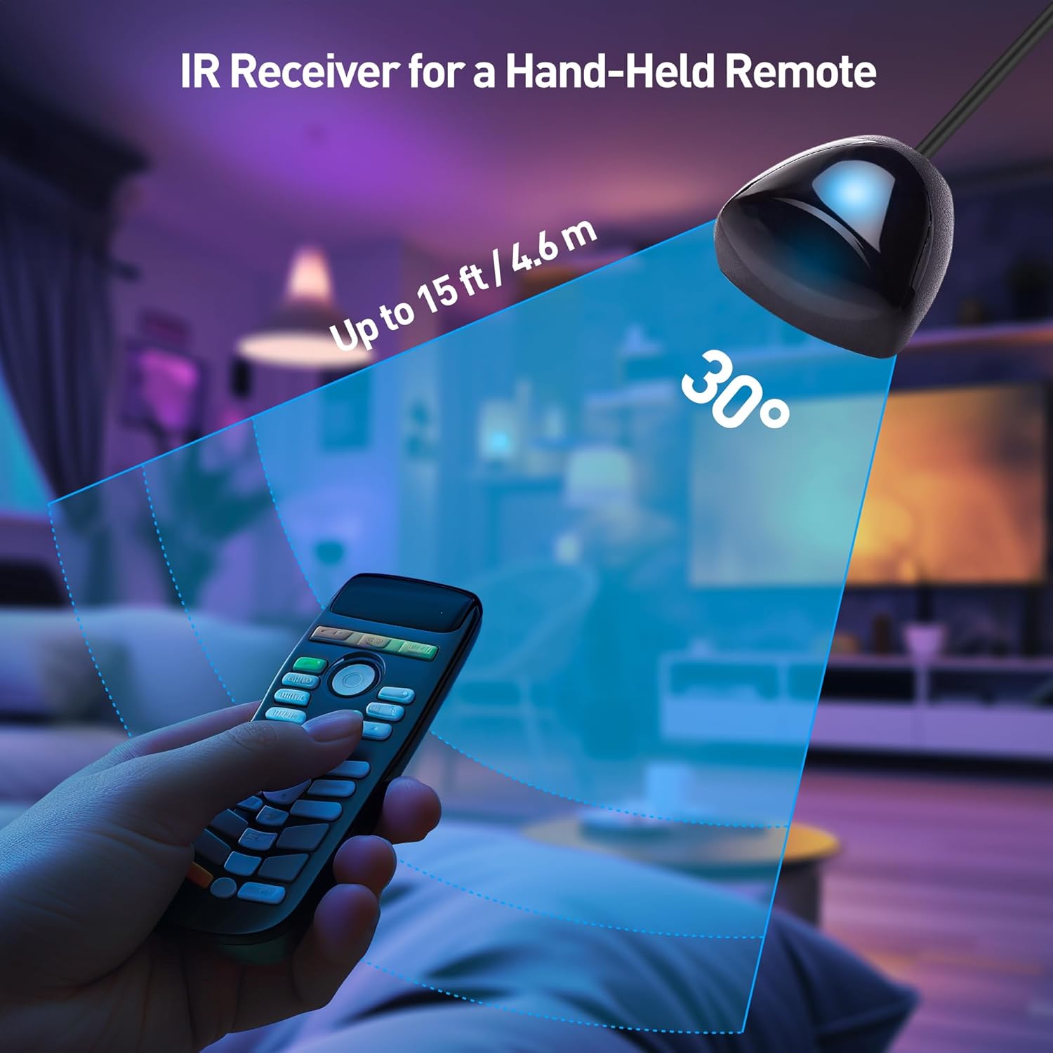 IR remote control cable extends the signal to a video source like a Blu-ray player so it can be controlled from your TV; Blue LED in IR Receiver bulb verifies the signal transmission