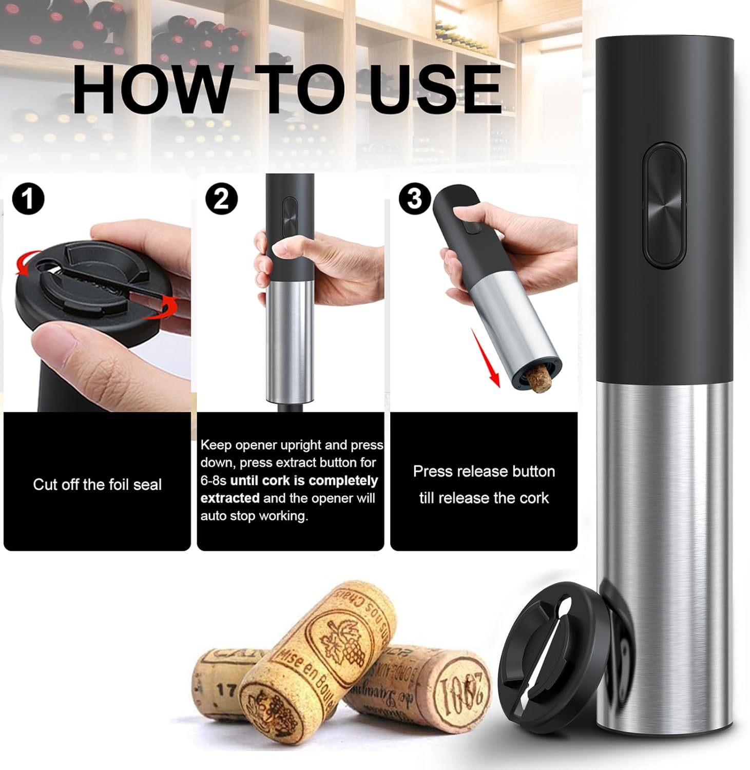 【Easy Operation & Automatic】 Just install the batteries firstly and rotate the foil cutter to remove the foil seal. Then hold the wine opener vertically on the top of the bottle firmly and press the extract button. When the cork is extracted, press the upper release button and it will come out automatically in seconds