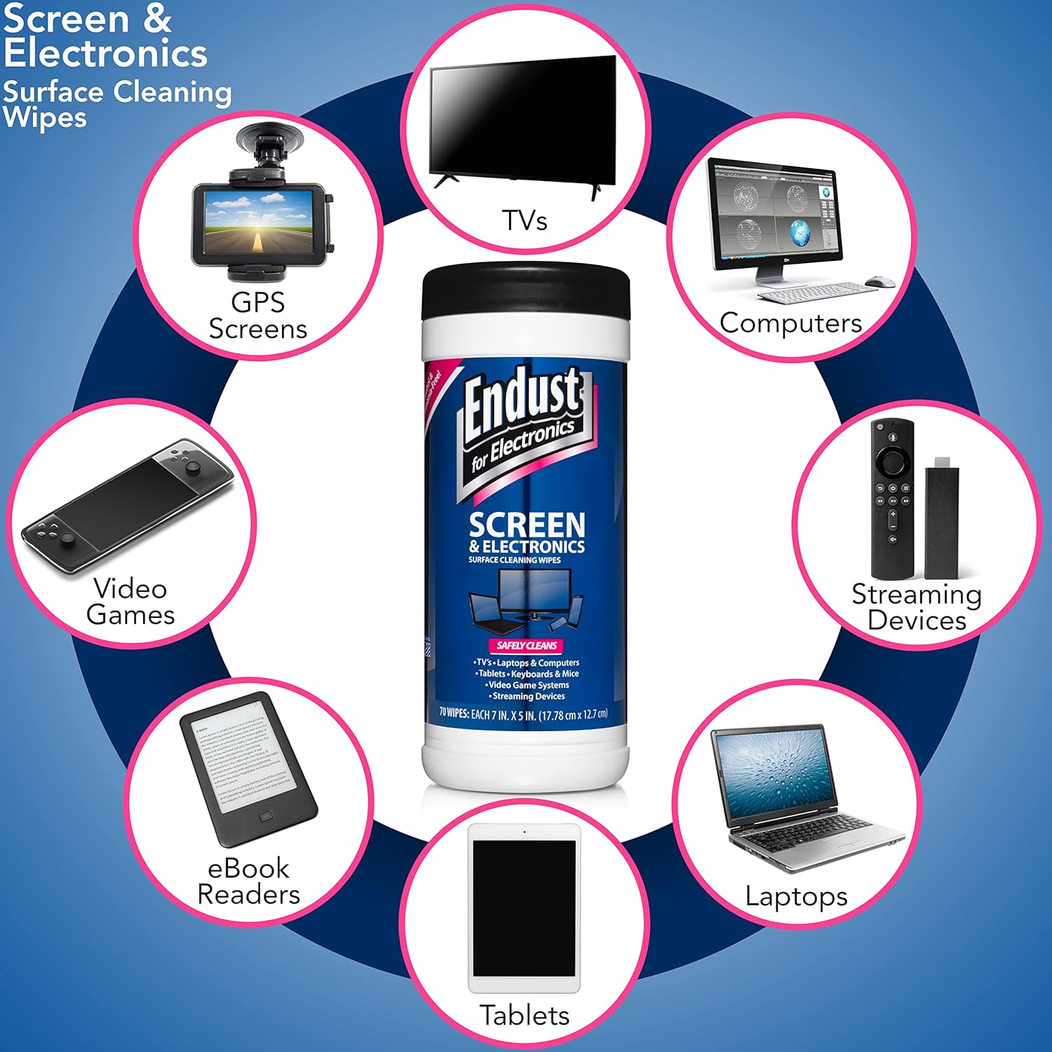 SCREEN & ELECTRONICS CLEANER: Endust screen wipes for electronics instantly removes dirt, dust, and fingerprints from your screen for a clear and clean surface without leaving residue or streaks. Gets rid of debris, helps reduce dust build up and skin oil smudges for distraction free vision.